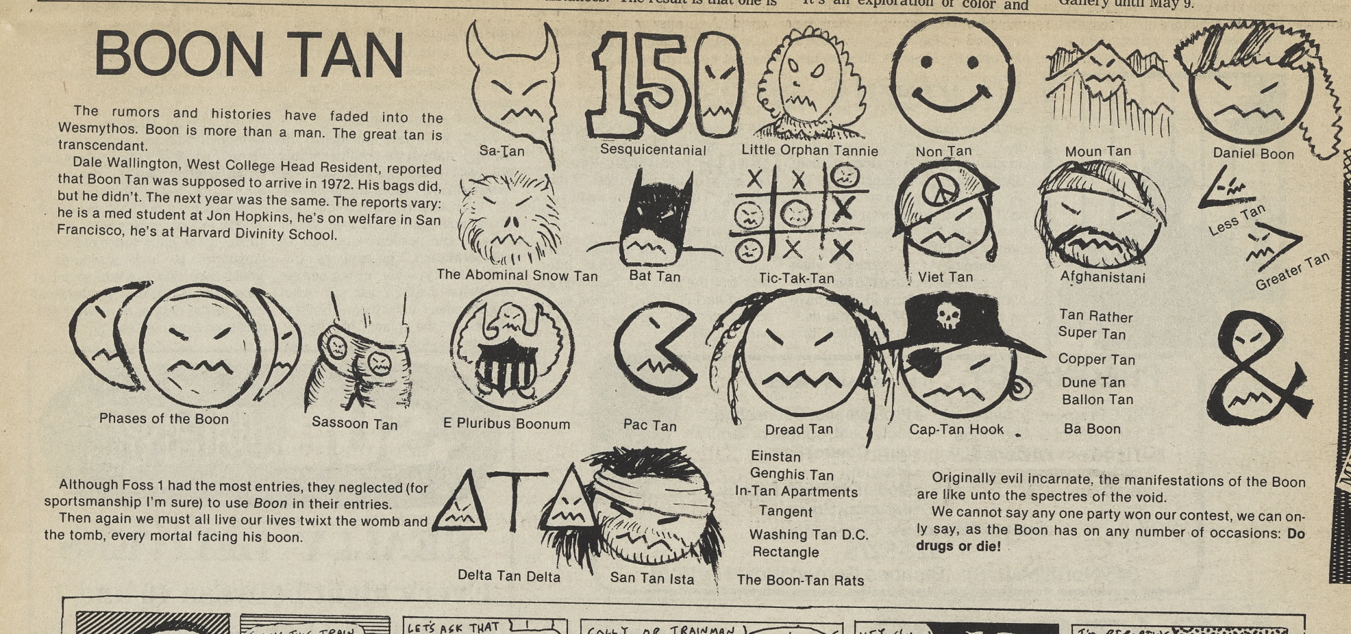 In the fall of 1972, first-year student Boon Tan from Malaysia never showed up. In his absence, a campus legend was born. Students began doodling a crude face with slanted eyes and a jagged grin—which they called the “Boon”—onto basement walls, stairwells, and rooftops across the University and beyond. Before long, Boon Tan had become part of Wesleyan’s folklore: a visual emblem of the school’s alternative identity, an anchor of belonging in a fragmented community, and, unmistakably, a racialized caricature of “the evil incarnate.”